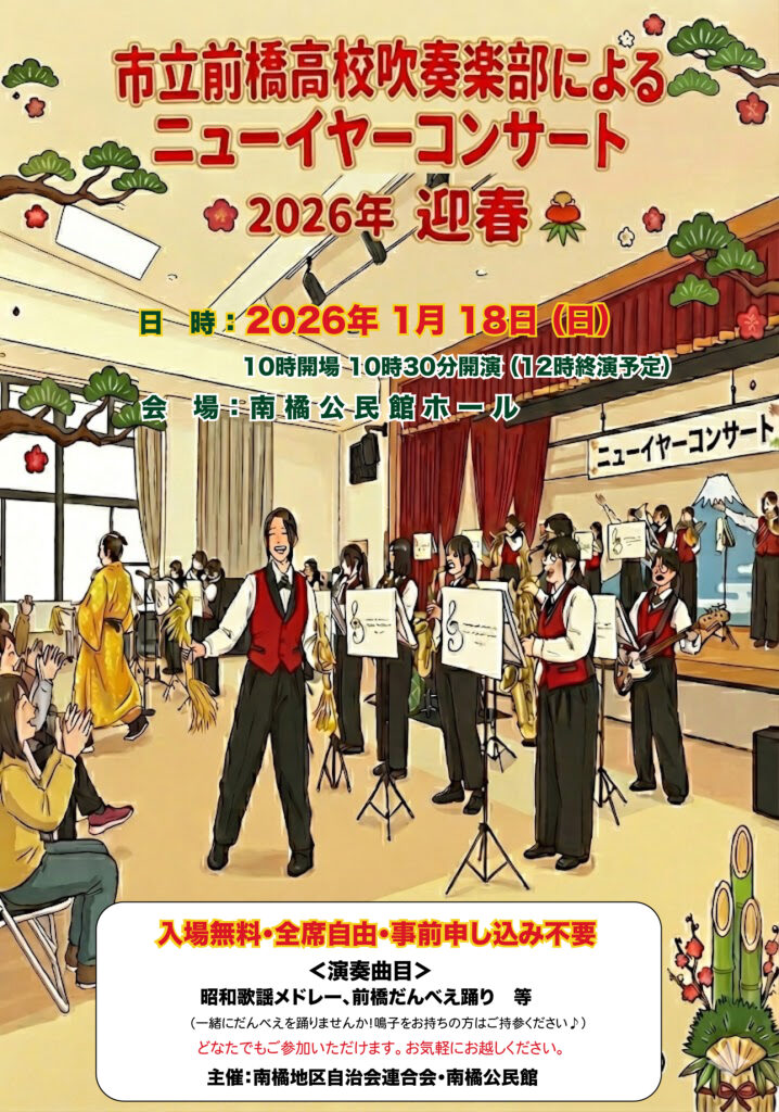 また、年が明けた2026年には、南橘地区自治会連合会・南橘公民館主催の「ニューイヤーコンサート」の開催も決定いたしました。新年の幕開けに、皆さんで一緒にだんべえ踊りで盛り上がりましょう!観て、聴いて、踊って楽しめる1時間30分です。こちらも入場無料です。直接会場にお越しください!
