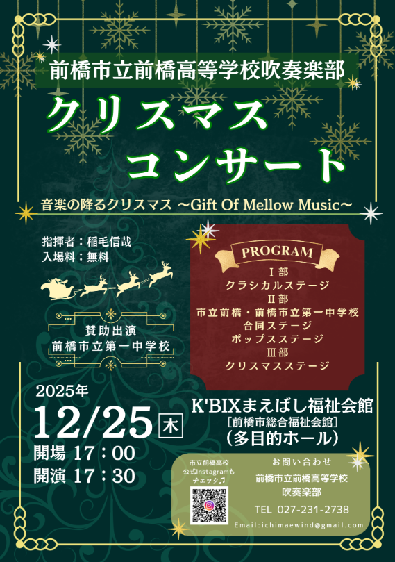 毎年開催している、恒例の「クリスマスコンサート」を今年も開催いたします。10年計画で前橋市内全てのの中学校吹奏楽部と共演する壮大な計画ですが、今年度の共演校は「前橋市立第一中学校吹奏楽部」の皆さんと共演させていただきます。