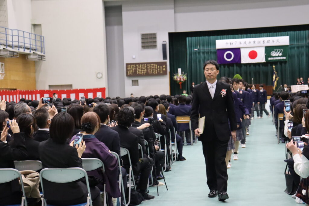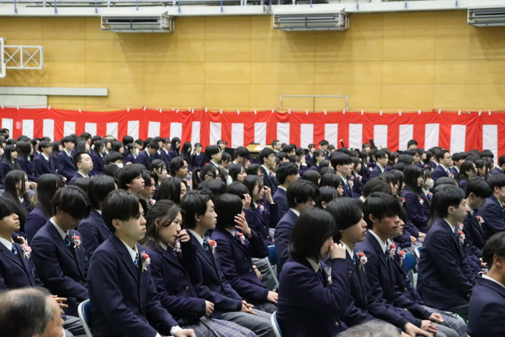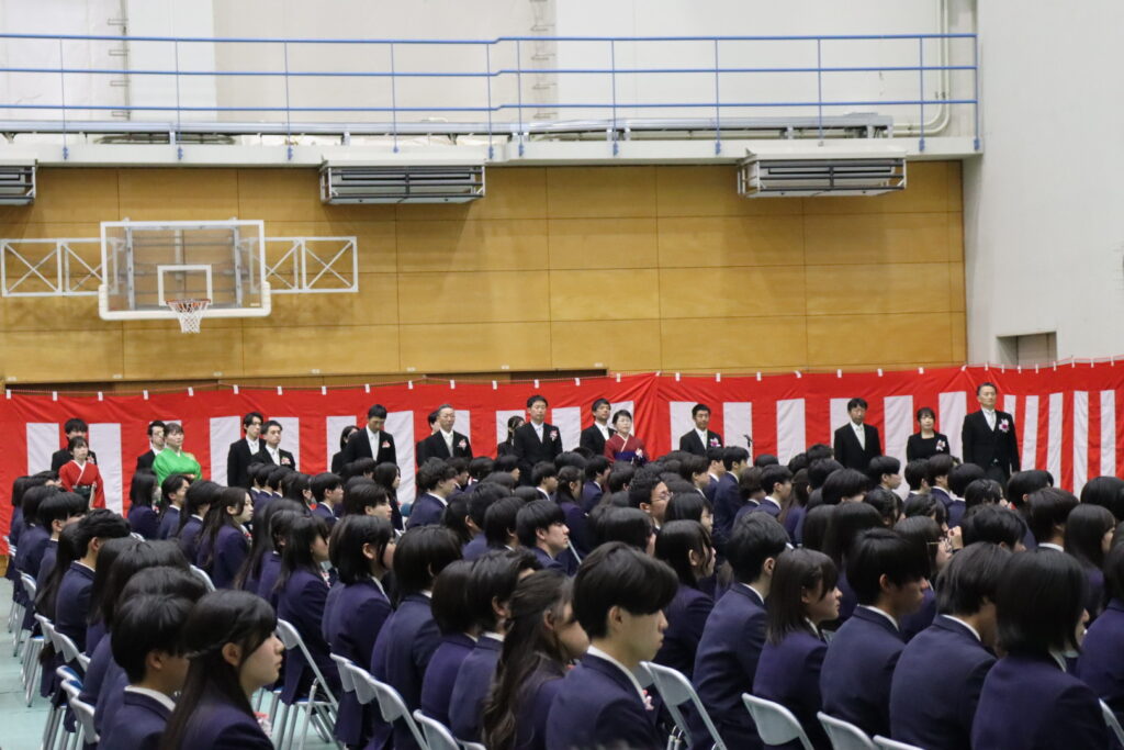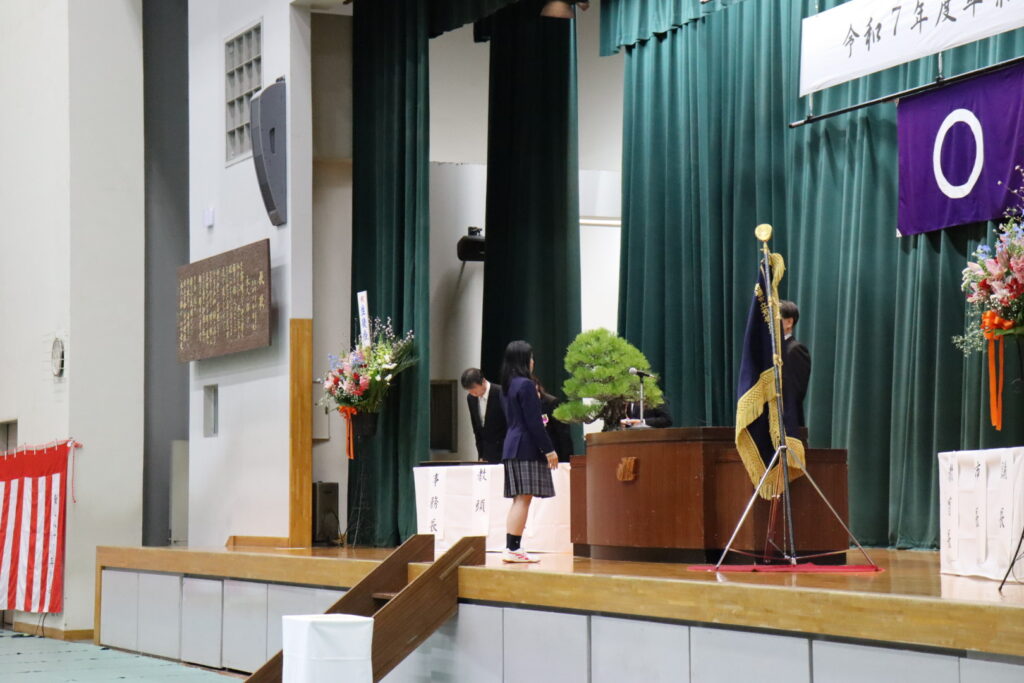 厳かな雰囲気の中、卒業生一人ひとりの名前が呼名され、代表生徒に卒業証書が授与されました。校長式辞では、学習や部活動、行事に全力で取り組んだ生徒たちの成長を称えるとともに、これからの新しい門出に向けた力強いエールが送られました。