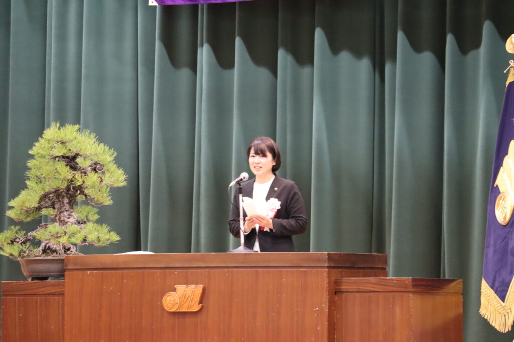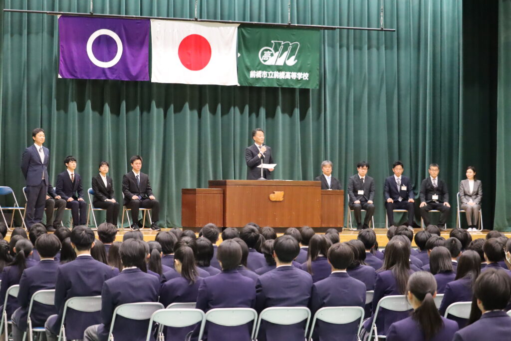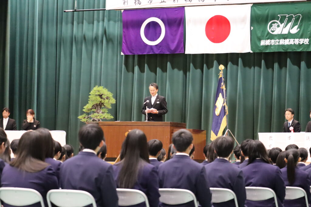 続いて、前橋市教育委員会教育長からの告示があり、前橋市長・本校PTA会長・同窓会長から祝辞をいただきました。温かな励ましと期待のこもったメッセージに、新入生たちの表情にも笑顔が見られ、本校での生活への意欲が感じられるひとときとなりました。
